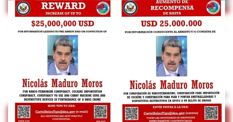 Publicações em inglês e espanhol feitas nas redes sociais da DEA anunciaram, na segunda-feira (28), que a recompensa foi elevada de US\$ 10 milhões (cerca de R\$ 56 milhões) para US\$ 25 milhões (aproximadamente R\$ 140 milhões). O valor coloca Maduro entre os indivíduos mais procurados internacionalmente pelas autoridades dos Estados Unidos.